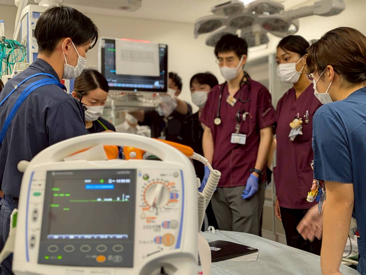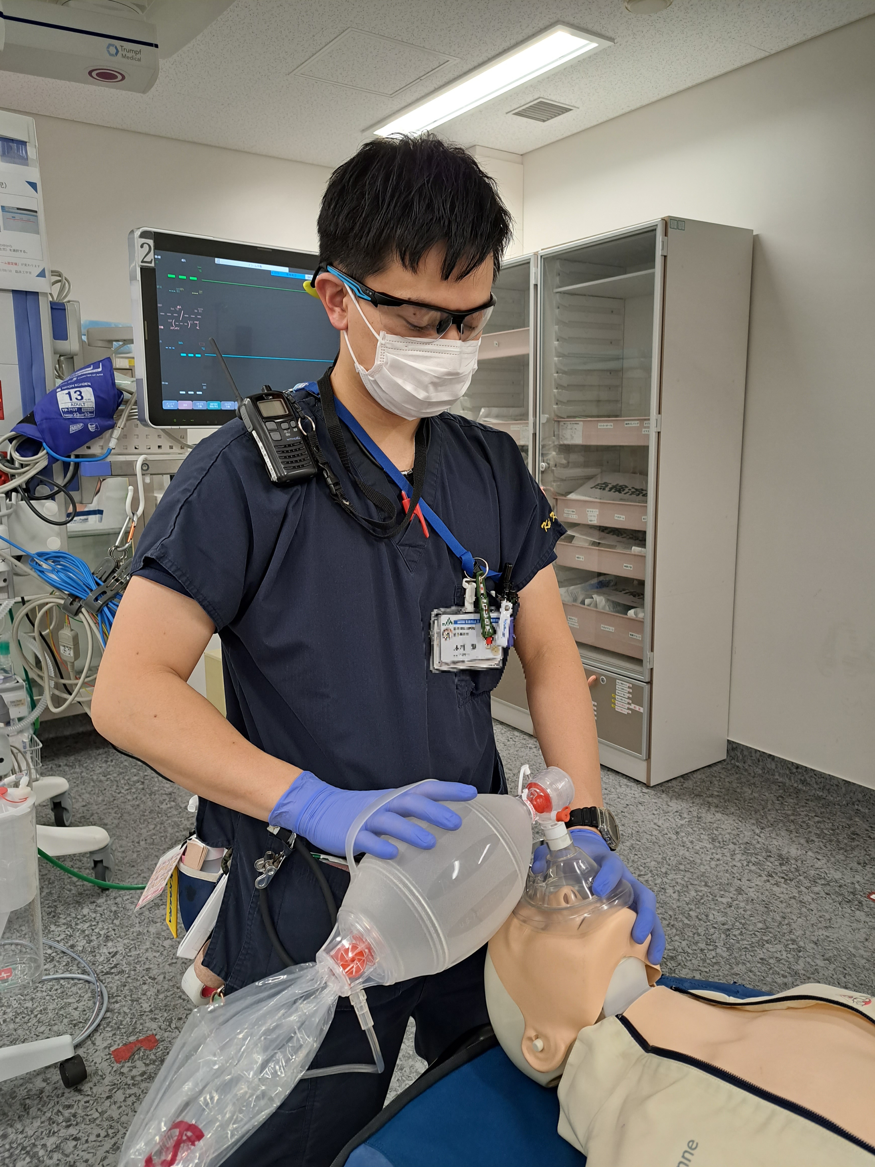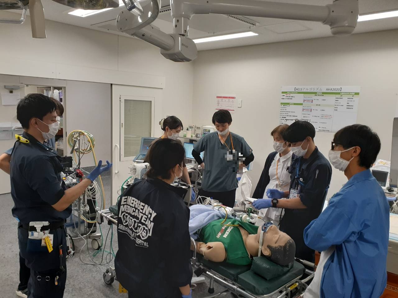 救急救命士科は救急対応のプロフェッショナルとして日々研鑽しています。急変対応やドクターカー活動のシミュレーション訓練、症例検討会や心電図・循環器等の勉強会、臨床工学技士とPCPS/IABP搬送訓練、救急外来看護師、研修医、病棟看護師と他職種合同で様々な訓練も定期的に行っております。