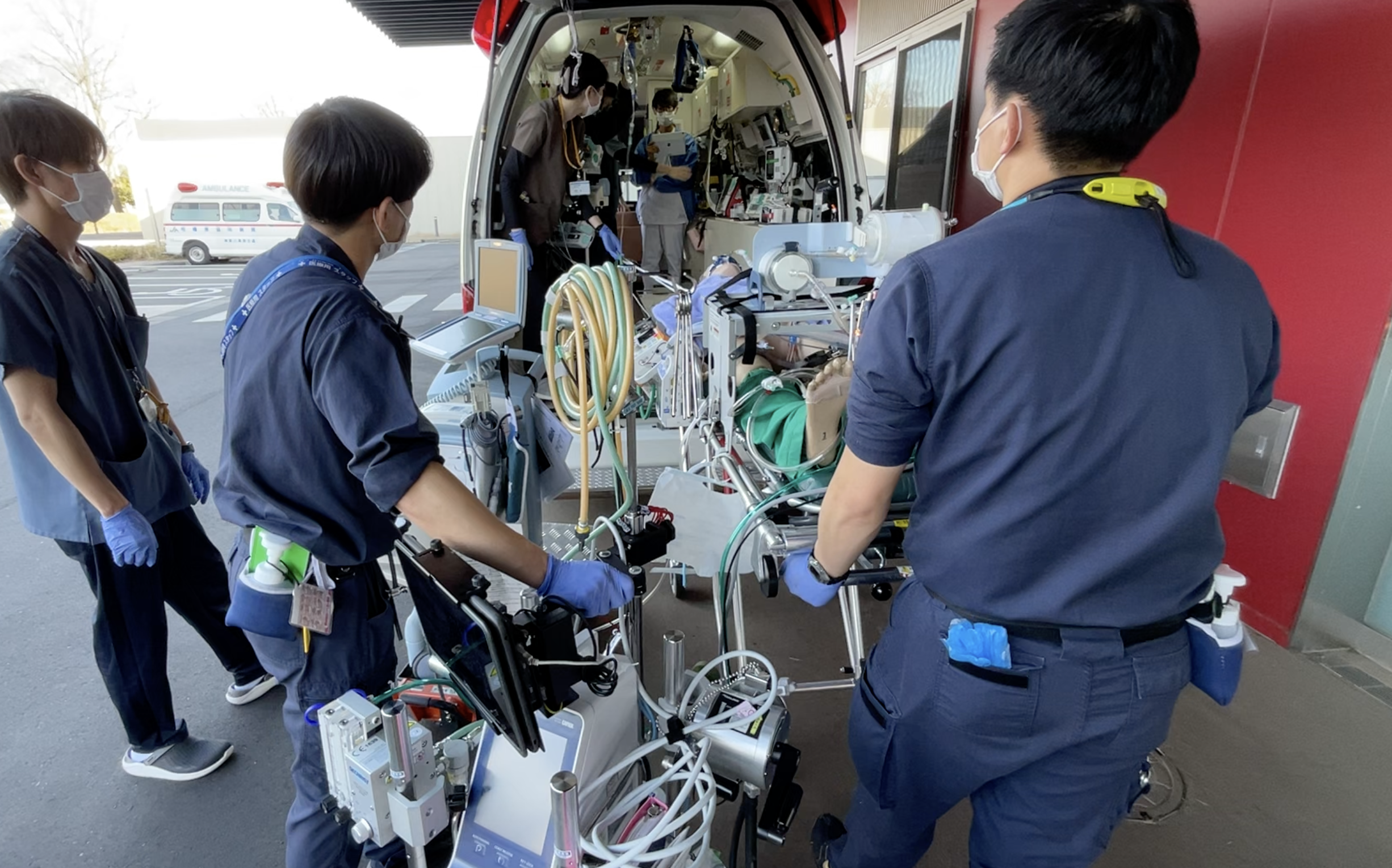 近隣医療機関・高齢者介護施設からの受け入れ要請(お迎え搬送※)に加え、当院→救命救急センターへの上り転送・転院、ECMO/IABP等の補助循環装置使用中の重症患者搬送にも対応しております。搬送中においても継続的な観察と必要な処置を実施し、患者様の安全を最優先に迅速かつ質の高い医療を提供しています。