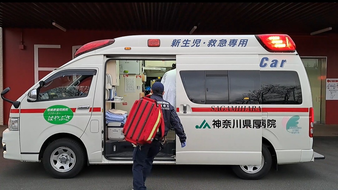 当院のドクターカー業務は、他院からのお迎え搬送※、新生児搬送、一般の救急車では搬送困難な医療機器(ECMO、PCPSなど)を使用中の重症患者搬送など数多くの転院搬送を担当しています。安全・確実・迅速に搬送するため、当院独自の緊急走行運転員養成プログラムを作成し、当院救命士は研修を行っております。院内では救急外来に配置され、救急科医師の指示の下、救急外来看護師と急変対応や診療の補助を行い、年間約8000名の救急患者を受け入れ相模原市の救急医療を支えています。