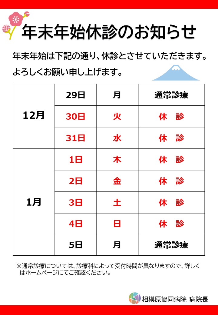 年末年始の外来診療の休診は以下のとおりです。令和7年12月30日(火)から令和8年1月4日(日)まで休診となります。