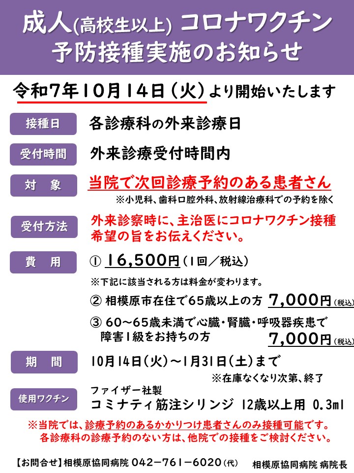 当院では、診療予約のあるかかりつけ患者さんのみ接種可能です。